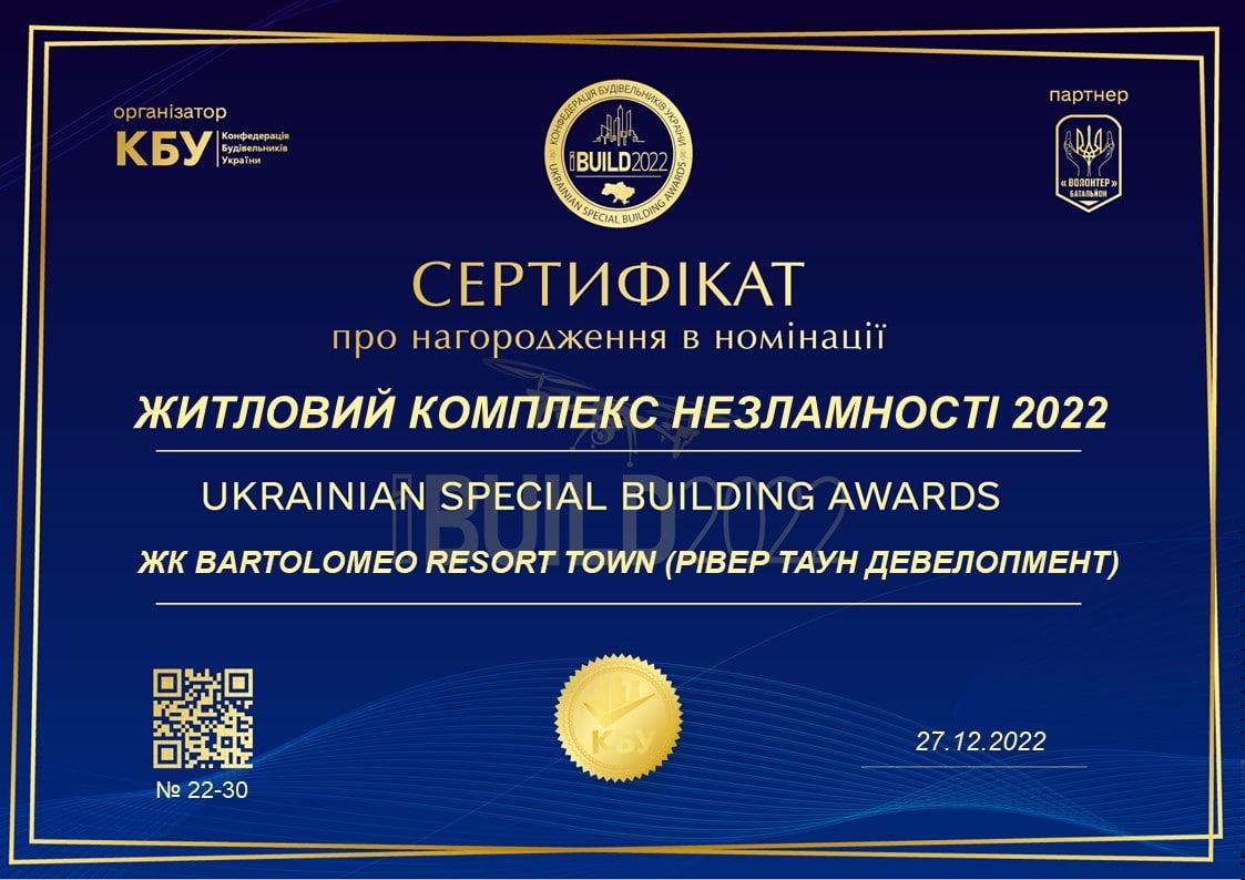 ЖК BARTOLOMEO RESORT TOWN СТАВ “ЖИТЛОВИМ КОМПЛЕКСОМ НЕЗЛАМНОСТІ 2022” НА ВСЕУКРАЇНСЬКІЙ ПРЕМІЇ iBUILD!