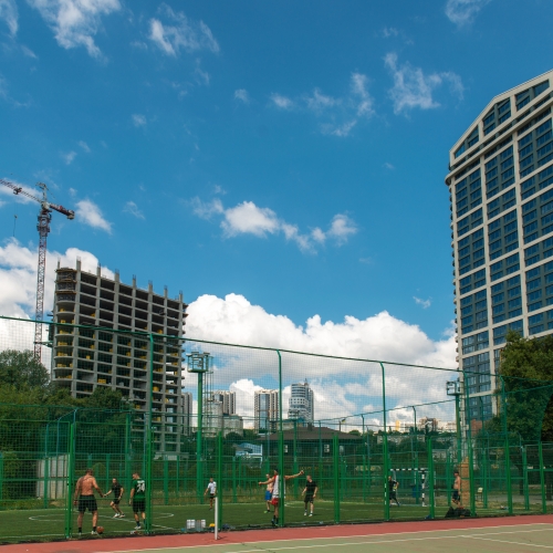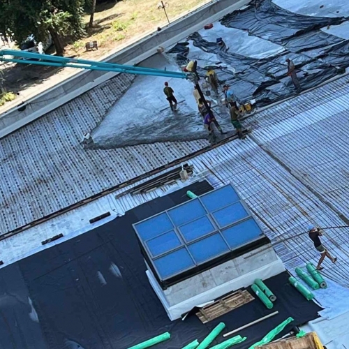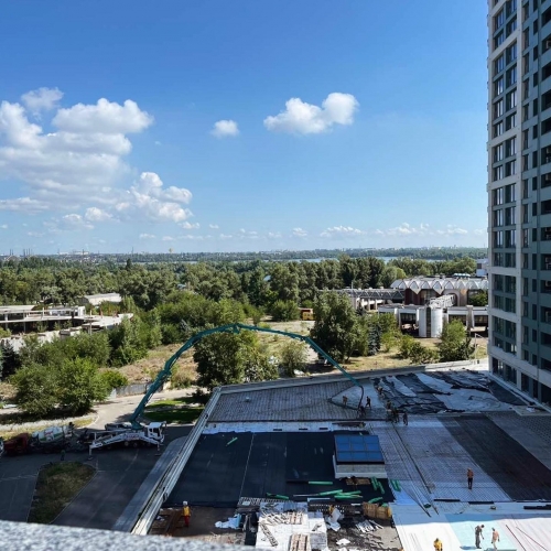 - активно працюємо над благоустроєм внутрішнього двору на даху стилобата Вежі І — ведуться роботи з гідроізоляції, виконується стяжка.